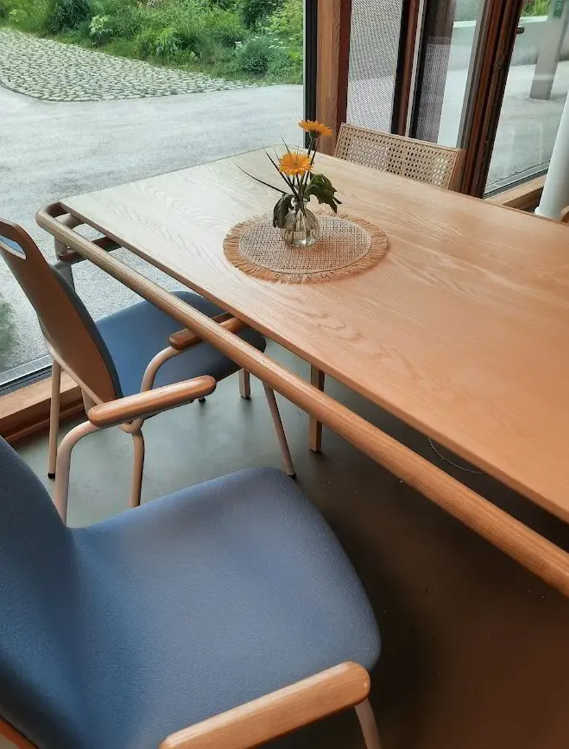 Dieser schöne Tisch mit seiner stabilen Tischumrandung erleichtert das Aufstehen und Hinsetzen enorm