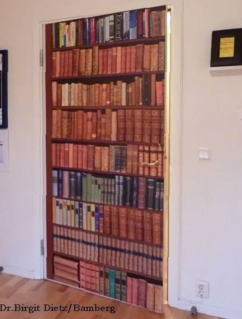 Hier wurde eine Tür in einer Pflegeeinrichtung ganz bewusst "unkenntlich" gemacht. Dieses vermeintliche Bücherregal kann jedoch Frustration bei manchen Menschen mit fortgeschrittener Demenz hervorrufen, wenn sie versuchen sollten, sich ein Buch zu nehmen.