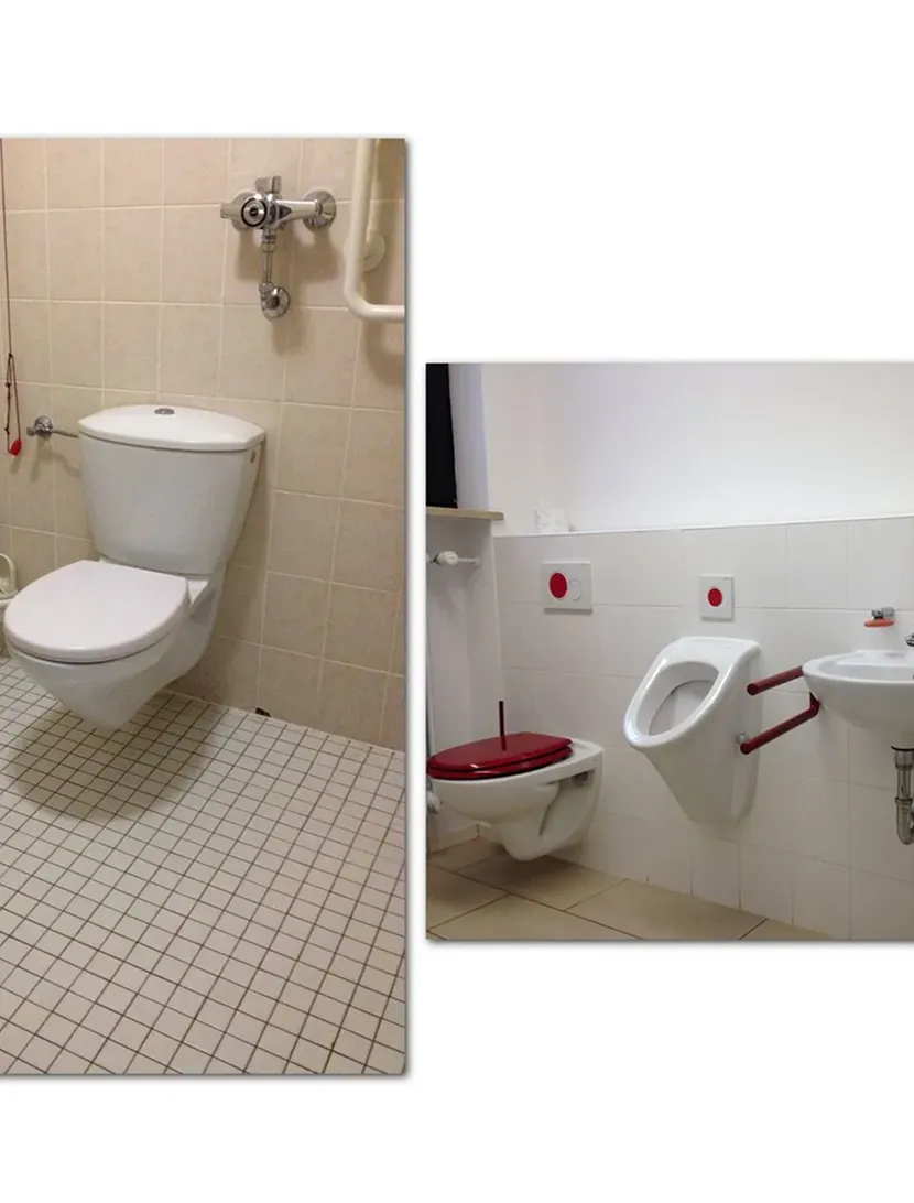 Badezimmer und WCs, die Ton in Ton gehalten sind (meistens alles in weiss), können bei Menschen mit fortgeschrittener Demenz zur großen Herausforderung werden. Farbliche Kennzeichnung macht einen großen Unterschied und verlängert definitiv die Selbstständigkeit im Alltag